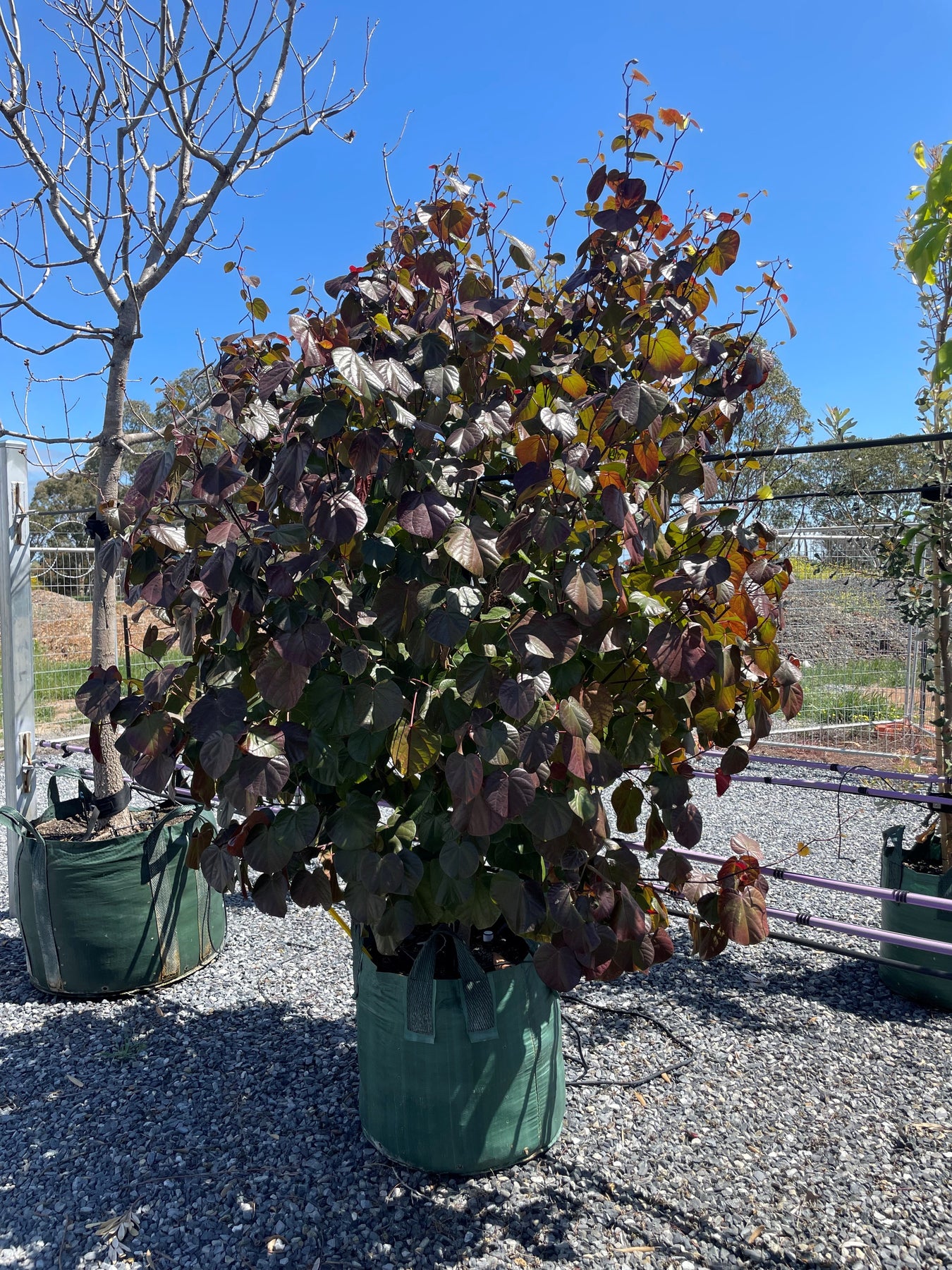 Hibiscus tiliaceus ‘Rubra’ (Red Cottonwood) brings instant coastal vibe and year-round colour to South Australian gardens. Large, heart-shaped leaves emerge rich bronze-red to burgundy and mature to deep olive with a purple sheen. In warm months, classic hibiscus blooms open buttery yellow with a maroon throat, then age through orange to red before dropping—so the plant always looks “in flower.” Excellent as a fast screen, feature, or trimmed hedge; thrives in seaside, windy, and heat-exposed sites.