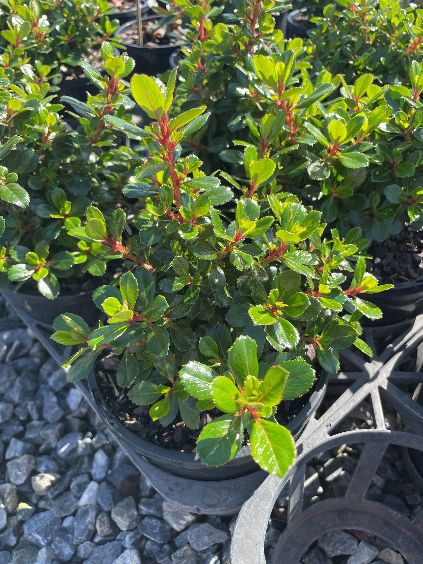 - Foliage: Glossy, small dark-green leaves; tidy, compact, clip-responsive habit; red stems add contrast