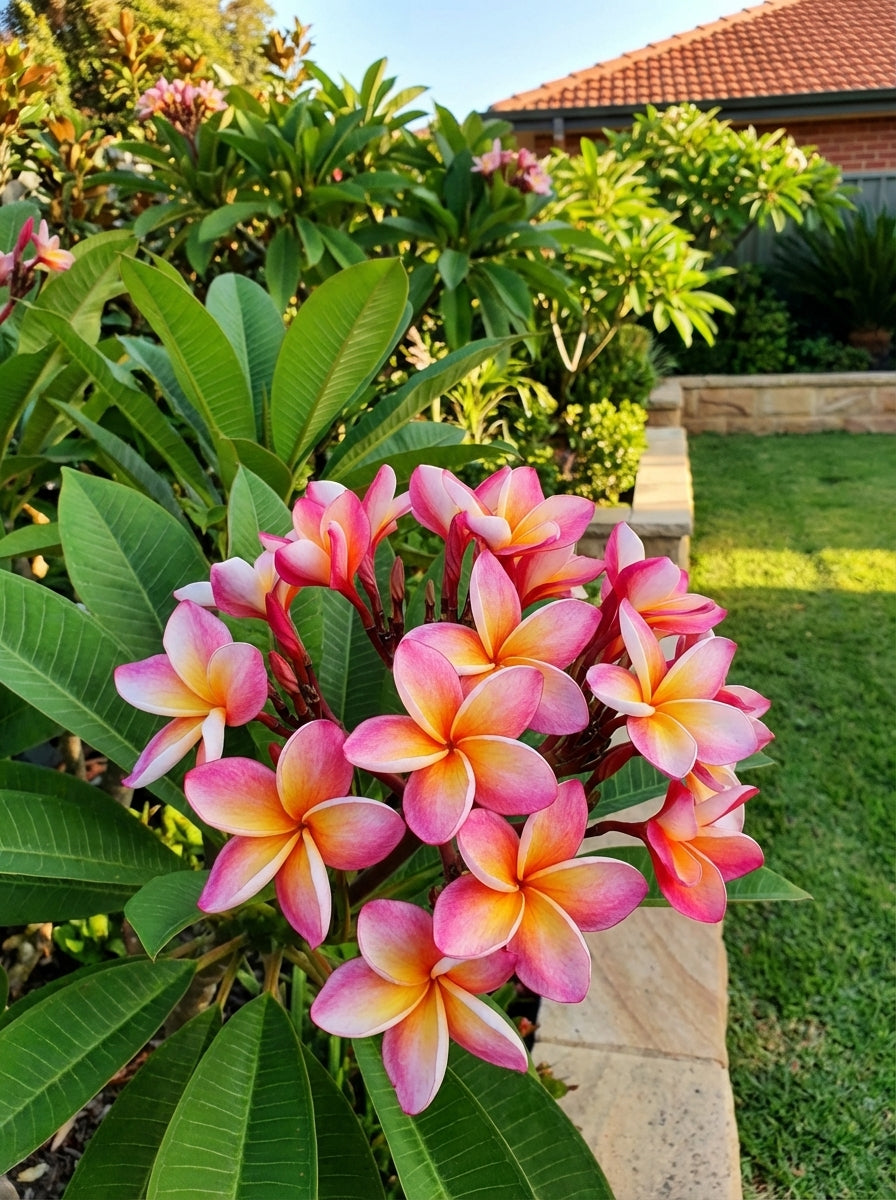 'Tri Colour' is pure summer theatre. The blended pink, lemon and white blooms are genuinely unlike anything else in the garden, and the intoxicating frangipani fragrance on a warm Adelaide evening is an experience in itself. Heat-loving, drought-tough and spectacular in full flower — this is the plant that will stop guests in their tracks every single time.